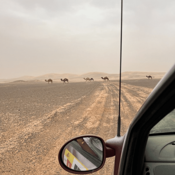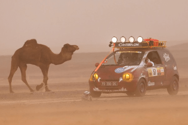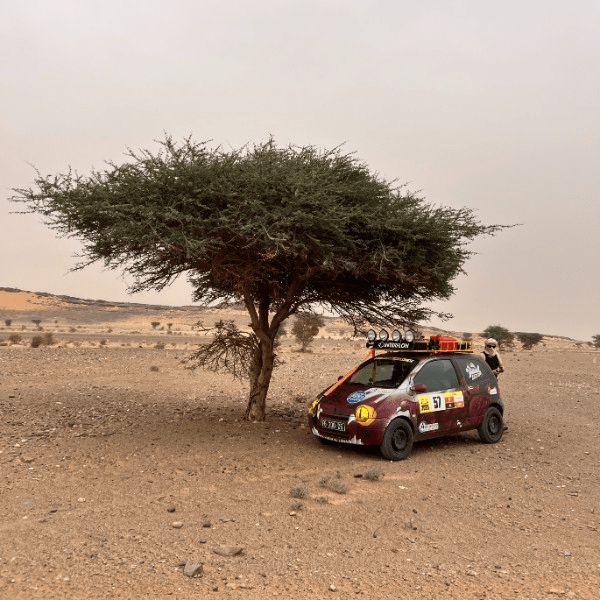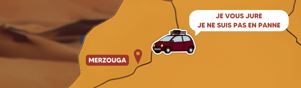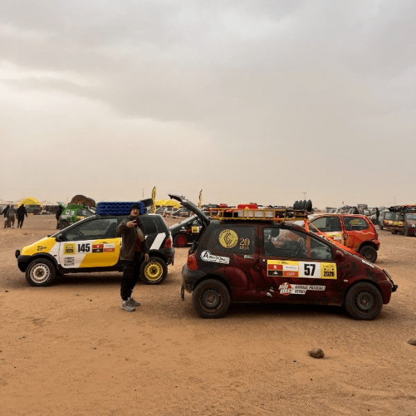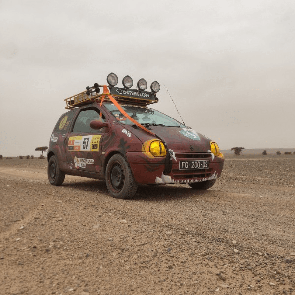 ­JOUR 9­Où sommes-nous ?­À Merzouga, encore et toujours.C'était notre dernier jour sur place à faire les zouaves dans les cailloux, demain on file à Taghbalt (pour faire les zouaves dans les cailloux).­Au menu du jour...­­La galère­Aujourd'hui on a un vent fort.Et qui dit vent fort dans le désert, dit tempête de sable. Et quand de la poussière vous fouette à 40km/h, ça ressemble un peu à du sablage.Bref le montage de tentes dans ces conditions c'est pas rigolo, mais considérer que c’est ça notre galère du jour prouve que la Twingo est solide.­­La rencontre­Les pistes se sont tellement bien passées que nous avons fini très tôt (14h environ).Nous sommes donc allés manger dans un restaurant local, des burgers et des frites locaux.Dans ce restaurant, nous avons rencontré un équipage corrézien, avec qui nous avons partagé une bière en contant nos aventures.­­La victoire­Ca paraît redondant, mais la Twingo roule toujours, et sans voyant !C'est exceptionnel pour nous qui avons clairement sous estimé cette voiture, adaptée à l’origine aux petites mamies qui veulent se garer facilement.Et pourtant, la touintouin dompte le désert comme personne, même si le confort intérieur (si tant est qu'il ait déjà existé) s’en trouve un peu détérioré.­La citationde deux pâtés­­T’as pas un marteau? — outil indispensable pour un large panel d’applications allant du plantage de sardine au redressement de jante­Et pour la suite...Demain, on refait de la piste. Mais ça va être solide : 280 km au total dont 80 km de piste ardue avec sable, cailloux tranchants et route défoncée. Encore une épreuve pour la touintouin !UN GRAND MERCI À NOS SPONSORS­